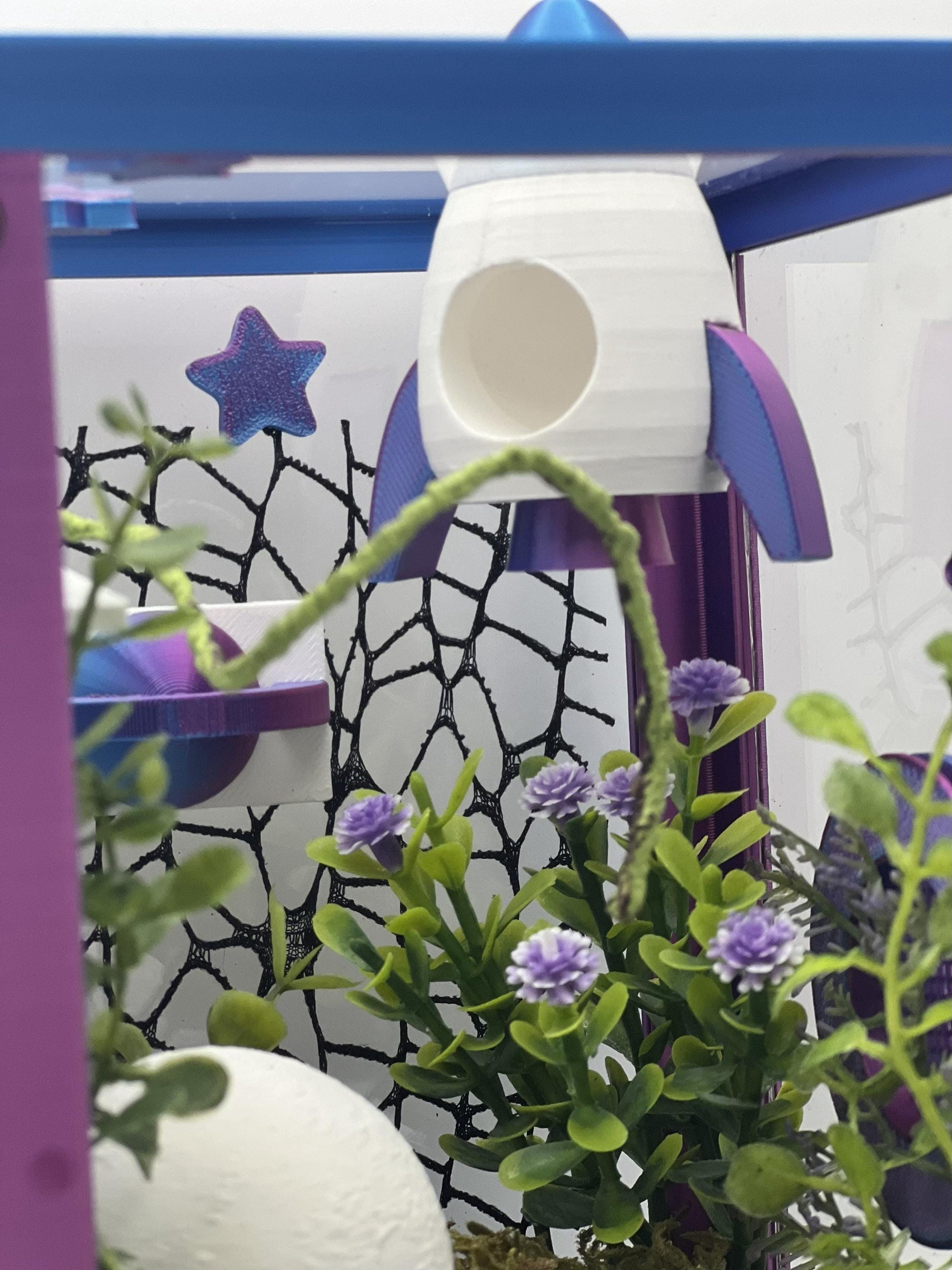 Send your jumper on an out-of-this-world adventure with this Cosmic Rocket Galaxy enclosure, designed in rich purple and deep-space blue tones with shimmering star accents. This celestial habitat gives your spider a dreamy universe to explore, complete with a rocket hide, orbiting planet shelf, crystalline star décor, and lush space-garden greenery. Perfect for display and daily enrichment, this enclosure turns your jumper’s home into a miniature voyage among the stars.