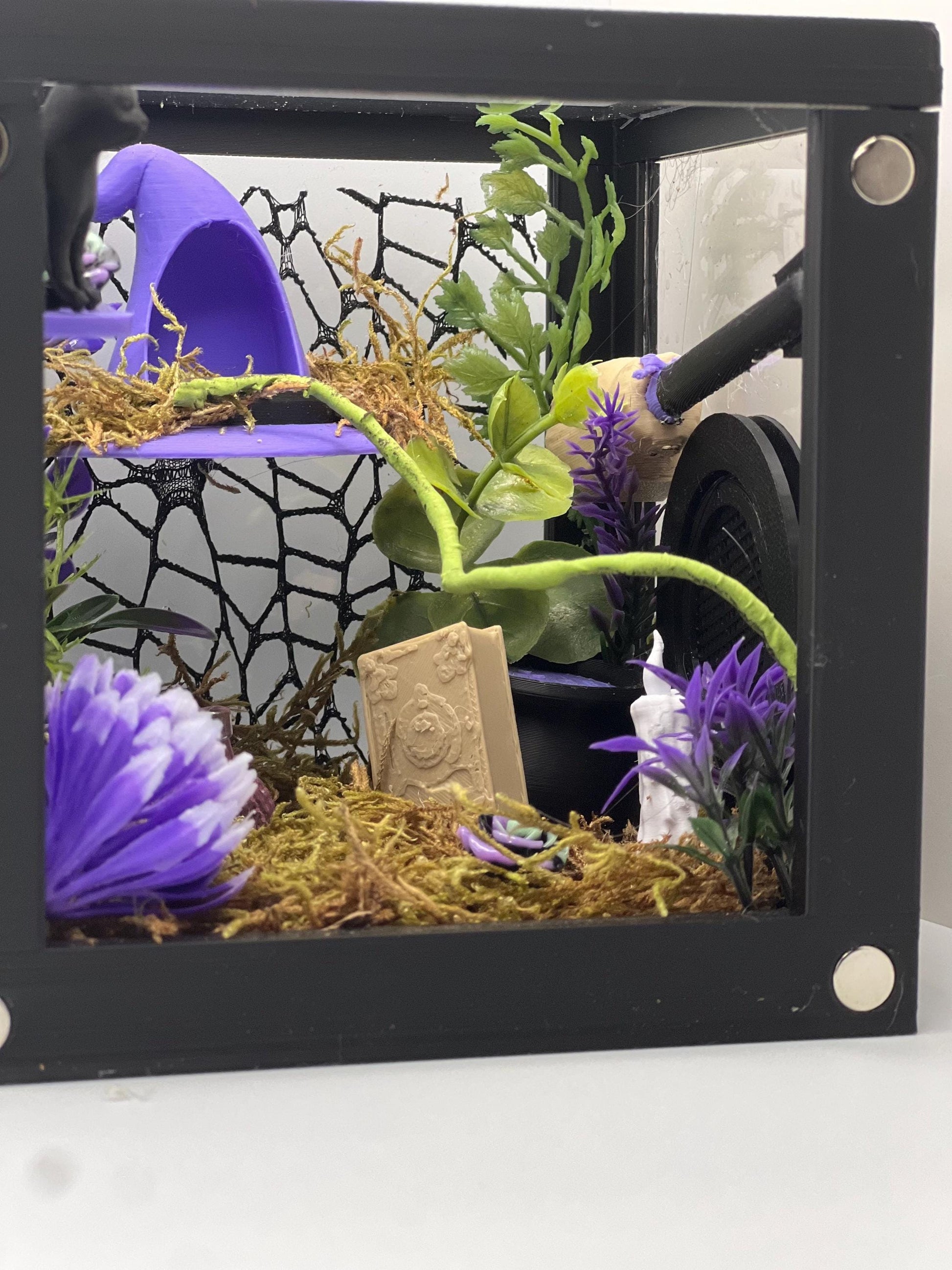 Give your jumping spider a whimsical magical realm with this Purple Witch’s Cottage enclosure, designed with enchanting violet tones and cozy spellcraft details. This theme blends cottage-witch charm with lush greenery and tiny mystical props, creating a dreamy environment your jumper can explore, climb, and hammock in while also serving as a beautiful display piece.