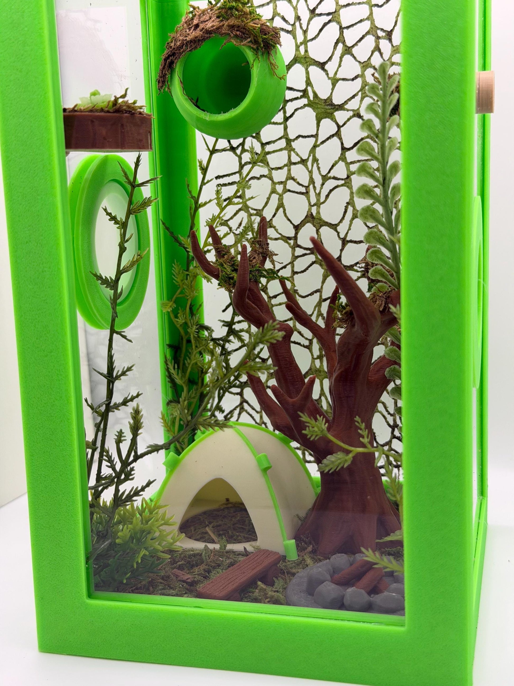 Fully decorated enclosure. Every enclosure is decorated by hand, which means placement of décor, plants, and details may vary slightly from piece to piece. These natural artistic variations make each habitat truly one-of-a-kind.