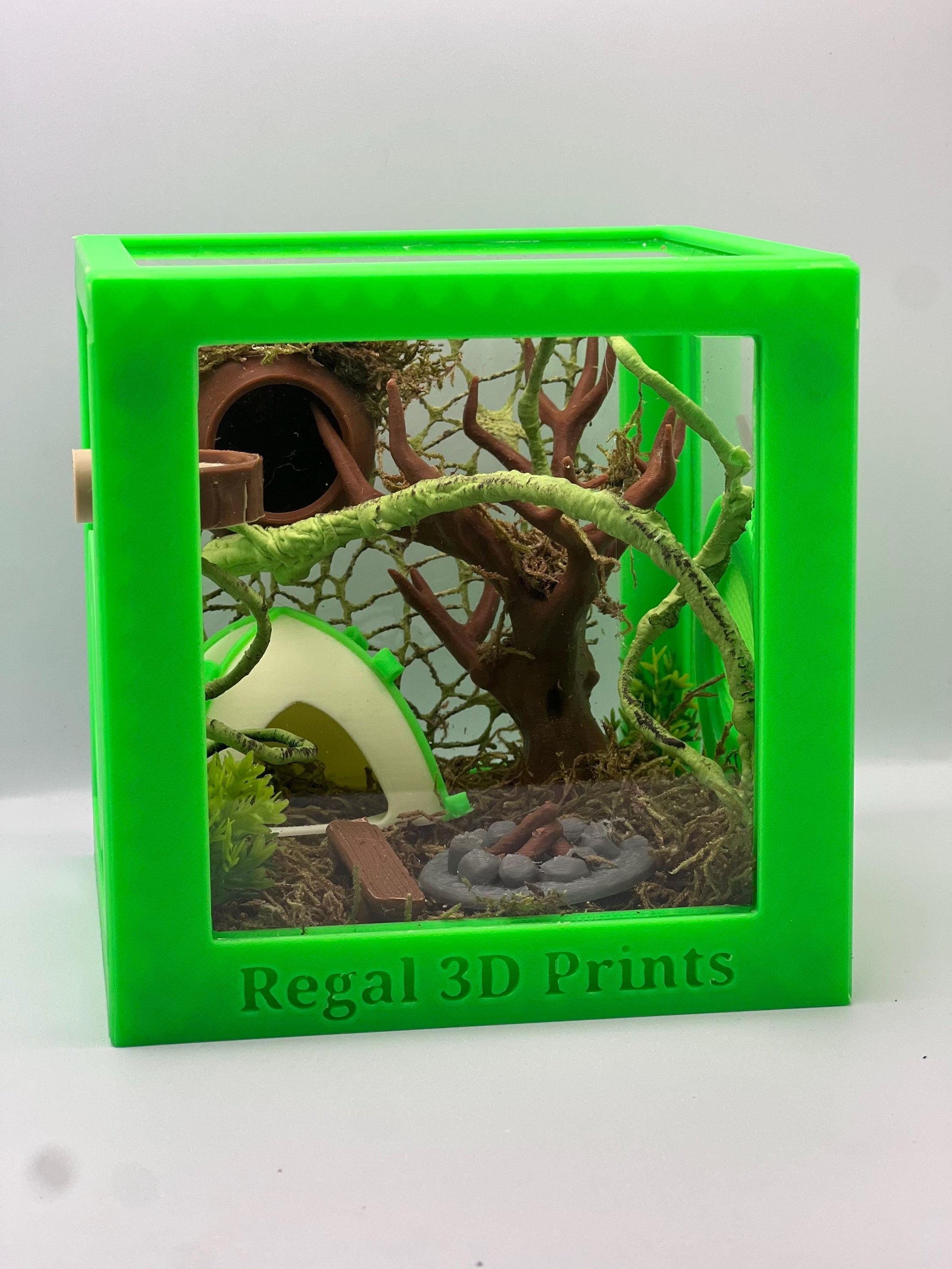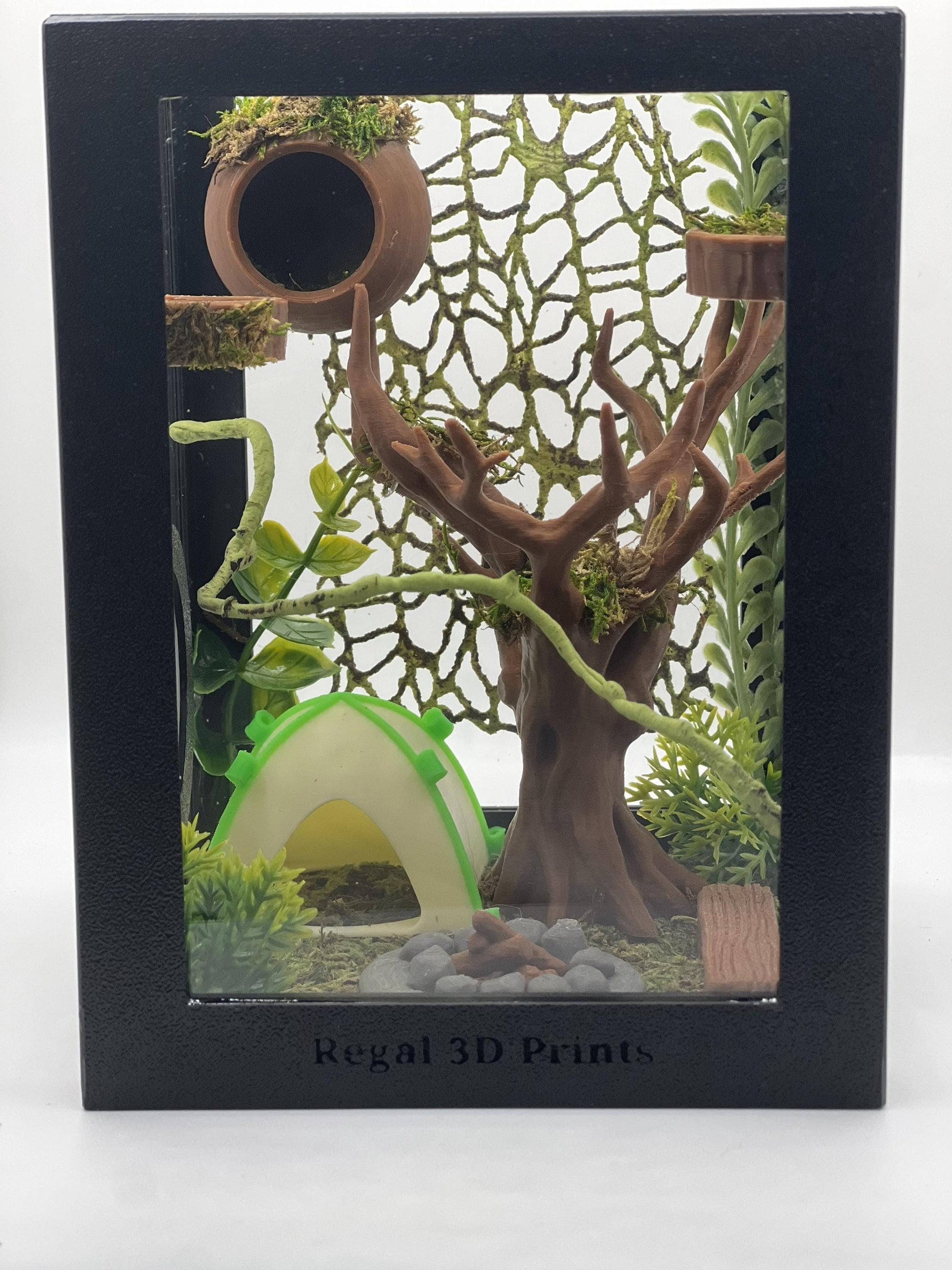 Give your jumping spider a tiny woodland getaway with this Forest Campout enclosure, designed in earthy tones with charming outdoor adventure details. This theme creates a warm, natural environment your jumper can explore, climb, and hammock in while adding a storybook-style display piece to your shelf. Featuring a miniature tent hide, crackling campfire scene, twisty forest branches, and lush mossy ground, this habitat feels like a magical little campsite tucked deep in the woods — perfect for any spider who loves a cozy spot to settle in.