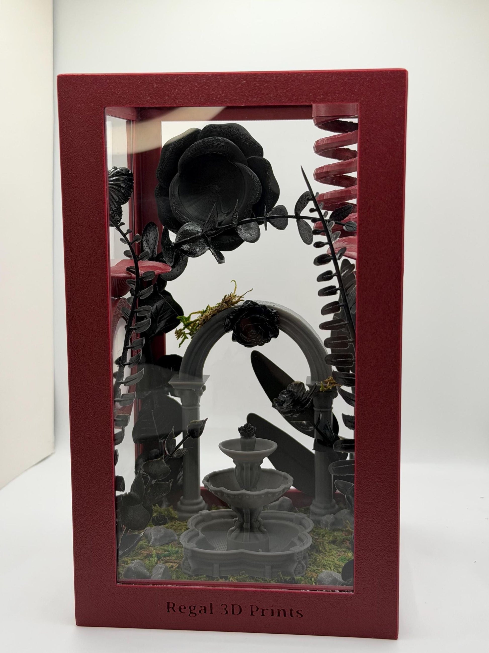 Step into a dark, overgrown garden with this gothic-inspired jumping spider enclosure, designed to blend moody elegance with functional vertical enrichment. Featuring black florals, creeping vines, stone-style accents, and a central fountain centerpiece, this enclosure creates a dramatic yet cozy environment your jumper can explore, climb, and web naturally. Perfect for gothic, dark romance, witchy, or fantasy-themed setups.