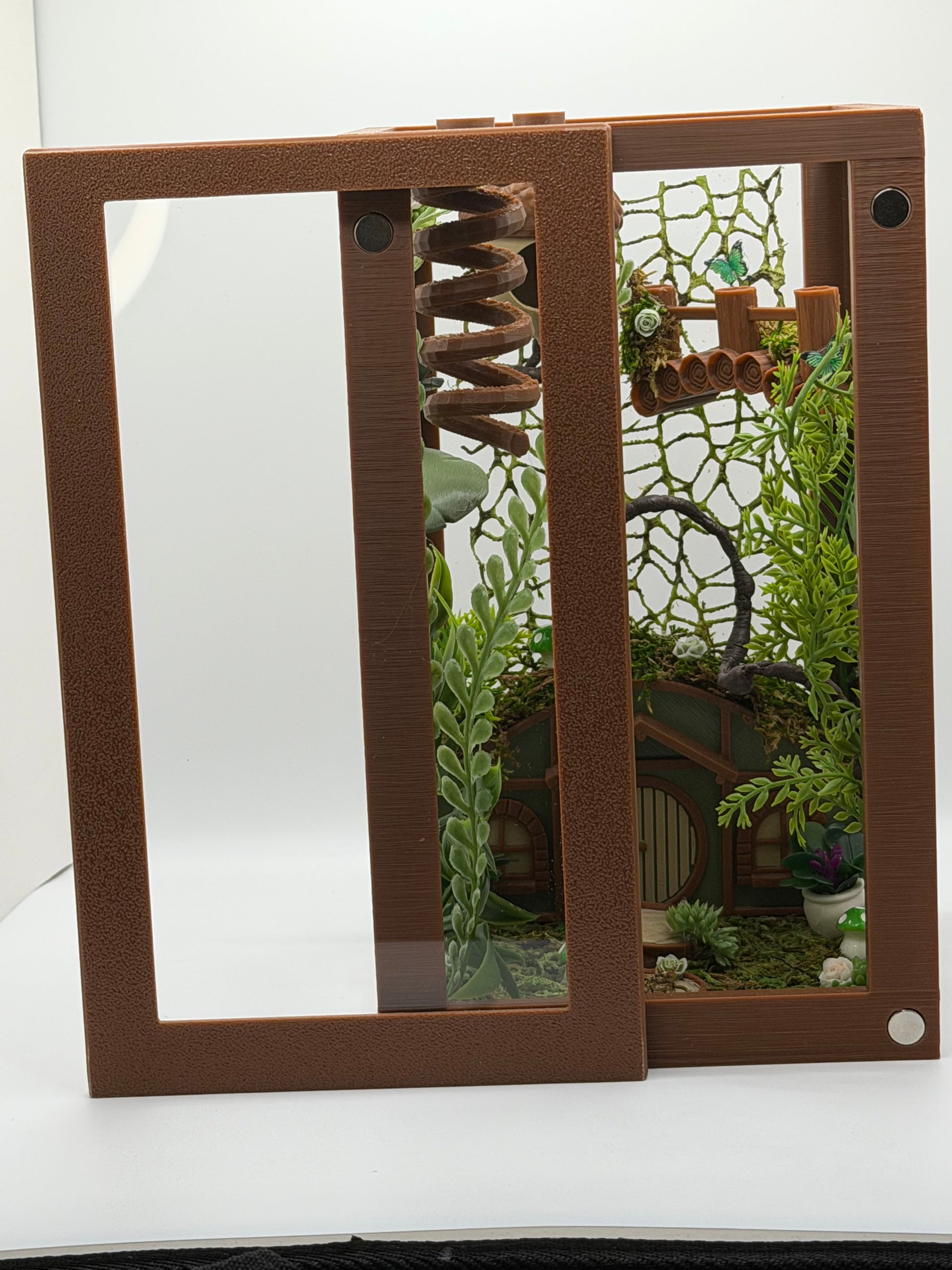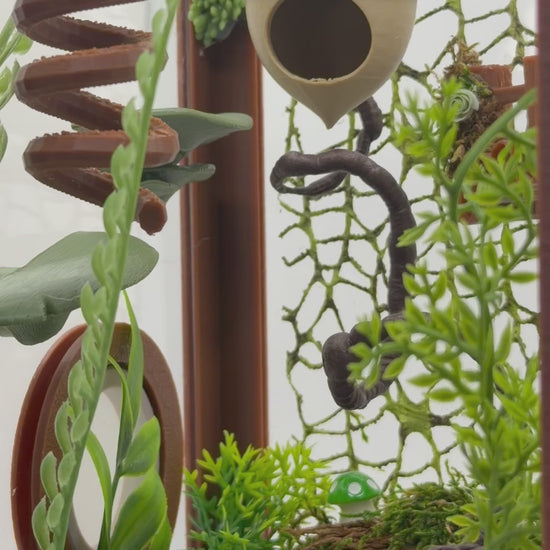 Bring fairytale forest vibes to your jumping spider’s home with this enchanted woodland cottage enclosure. Designed to feel like a hidden hobbit home tucked beneath moss and greenery, this setup combines rich earth tones, natural textures, and vertical climbing opportunities for both beauty and enrichment.
