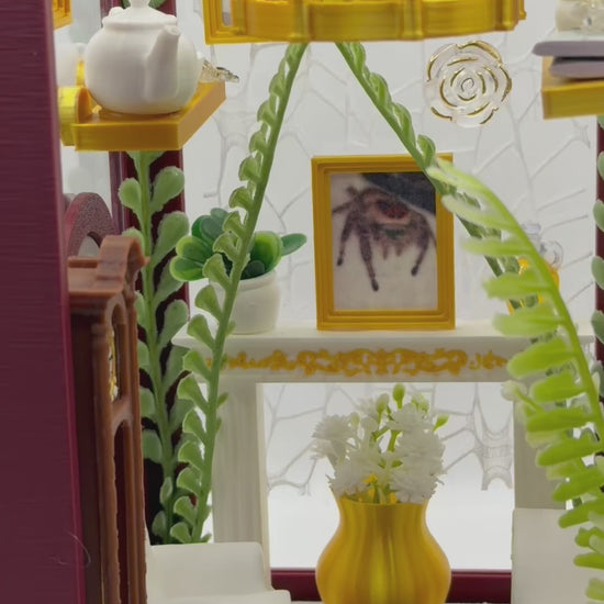 Step into a miniature Victorian sitting room designed especially for your jumping spider. This fully decorated enclosure is thoughtfully styled to resemble a classic parlor, complete with ornate furniture, framed artwork, lush greenery, and warm golden accents.